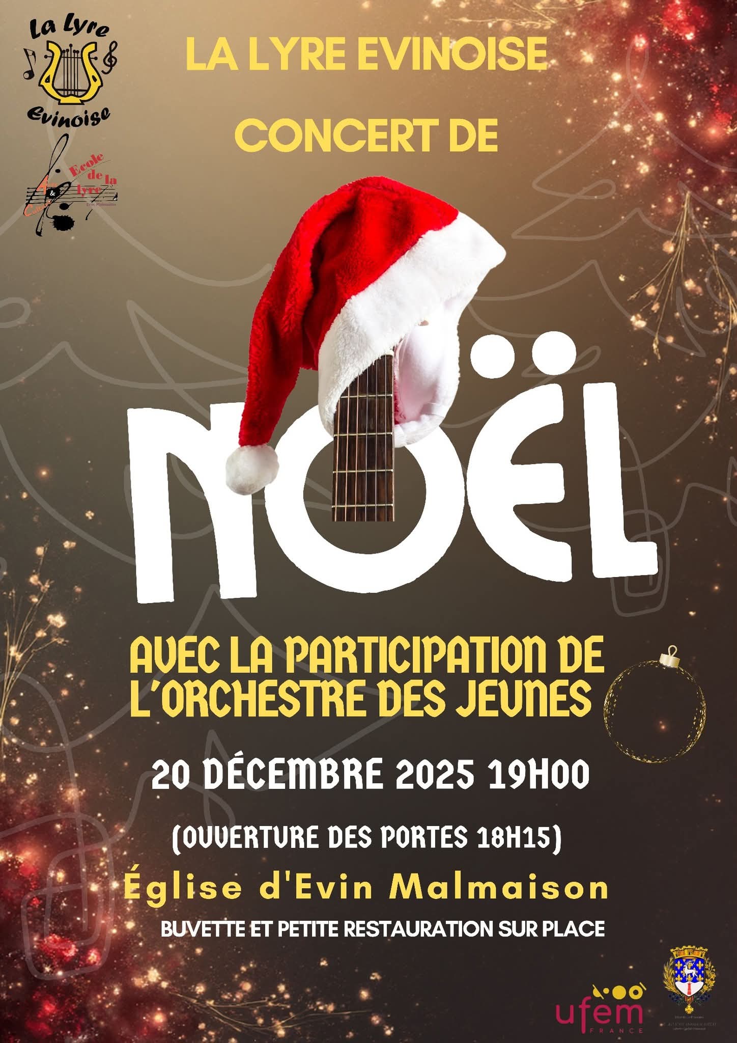 Concert de Noël de la Lyre Evinoise avec la participation de l'orchestre des jeunes. Venez nombreux écouter ces musiciens. Un programme éclectique et riche en émotion vous sera proposé. Soupe, vin chaud, croques monsieur, hot dog, crêpes et boissons vous serons proposé pendant l'entracte. |
