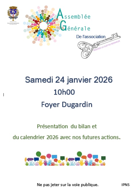 L'association evin'sion fantaisie vous invite à son assemblée général qui aura lieu le samedi 24 Janvier 2025 a la salle Dugardin à 10H. Cette assemblée est ouverte au public pour annoncer les actions mise en place pour cette nouvelle année 2026 et aussi échanger ensemble sur vos besoins et vos idées d'action |